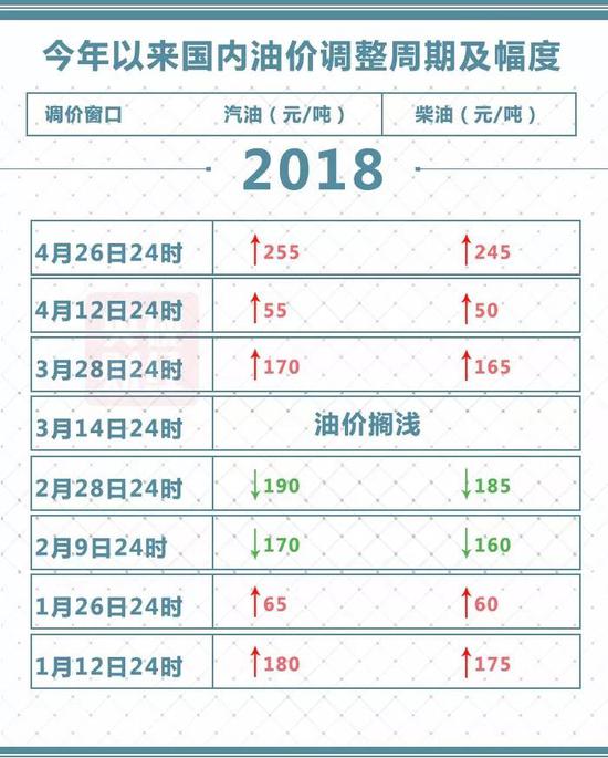 2018年我国油价调整周期及幅度(图片来源:新浪财经)