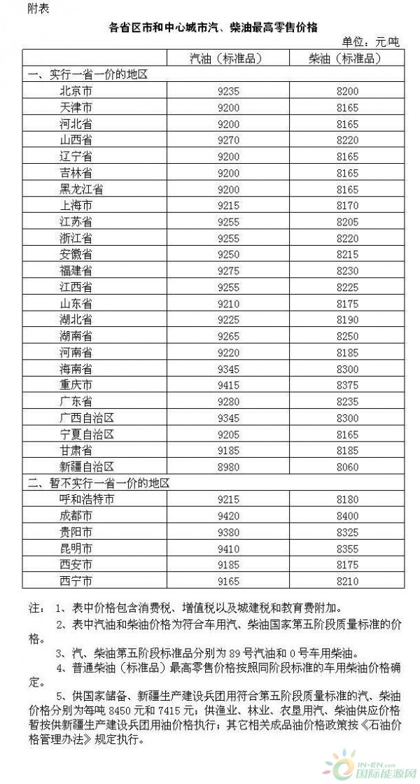 各省区市汽柴油价格情况 (图片来源:国际能源网)
