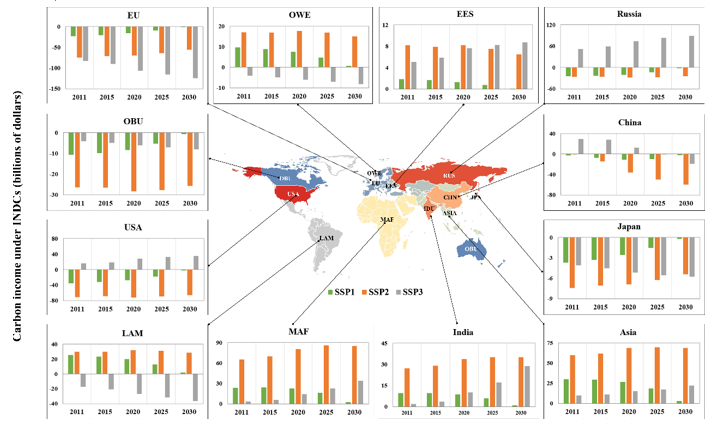 作为当今最重要的环境问题,气候变化深刻影响着经济、社会、政治、外交等领域,是全球必须共同面对的重大挑战。2015年12月通过的《巴黎协定》进一步明确了将全球温升控制在不超过工业化前2℃这一长期目标, 并将1.5℃温控目标确立为应对气候变化的长期努力方向,同时明确了未来全球减排将以“自下而上”的“国家自主贡献(Intended Nationally Determined   Contribution,以下简称INDC)”模式进行。综合评估模型(Integrated assessment model, IAM)是评价气候政策最主流的分析工具。国际主流IAM模型团队作为本领域研究的先行者,为气候变化政策评估做出了重大贡献。该文重点考虑了INDC目标下的共享社会经济路径变化。