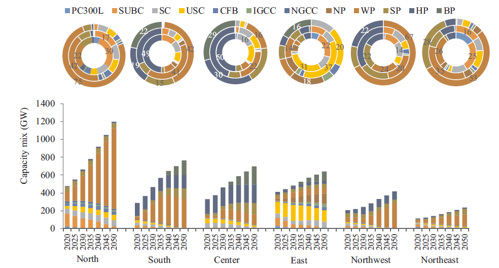 Fig. 2. Pathways of power generation technology selection in six regions.