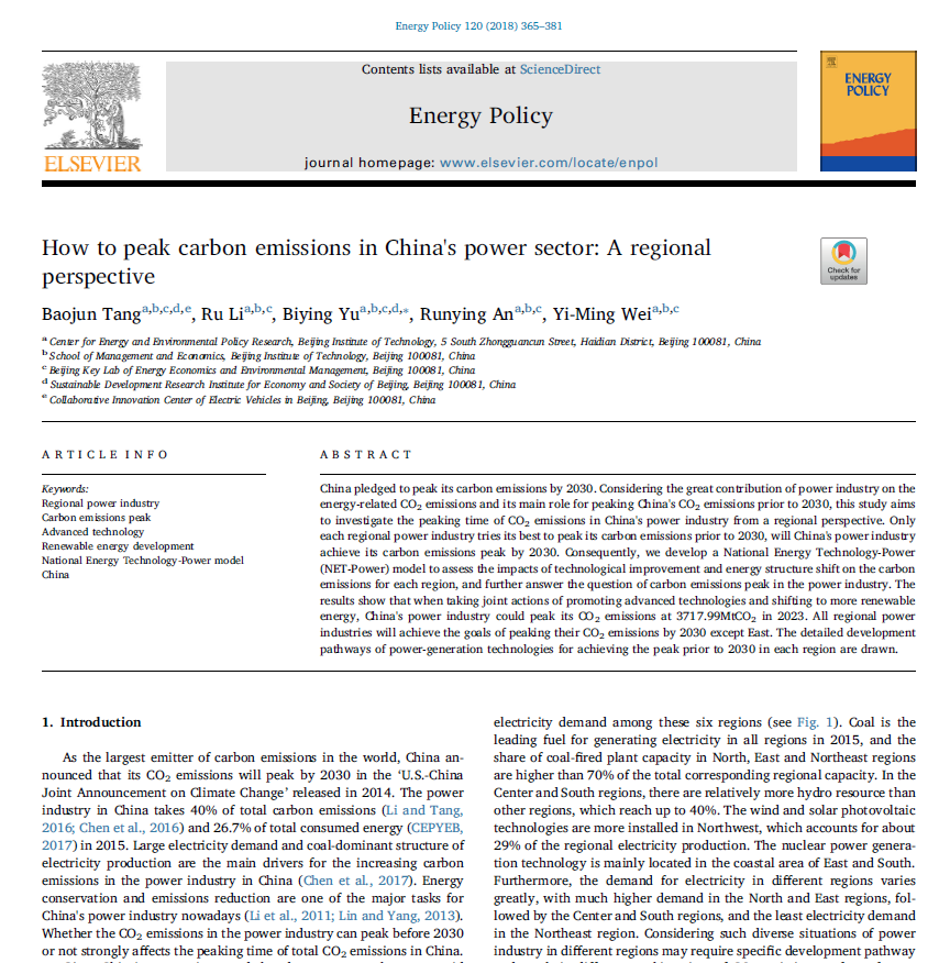 近期,唐葆君教授、余碧莹副教授和博士生李茹的论文“How to peak carbon emissions in China's power sector: A regional perspective”发表在Energy Policy上。