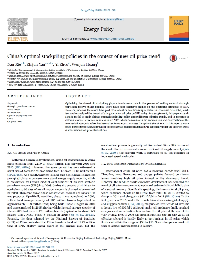 近期,中心颜志军教授、博士生谢楠的论文China’s optimal stockpiling policies in the context of new oil price trend发表在Energy Policy上。