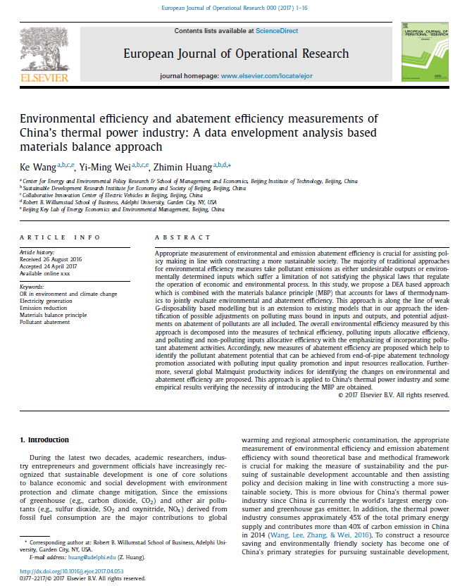 日前,由王科副教授、魏一鸣教授和黄志民教授合作的论文“Environmental efficiency and abatement efficiency measurements of China's thermal power industry: A data envelopment analysis based materials balance approach”在期刊European Journal of Operational Research发表。
