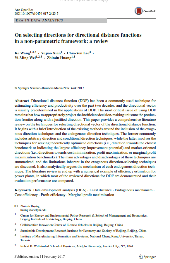 中心成员王科副教授、博士生鲜玉娇以及魏一鸣教授、黄志民教授的研究论文“On selecting directions for directional distance functions in a non-parametric framework: a review”近日发表在国际期刊Annals of Operations Research。