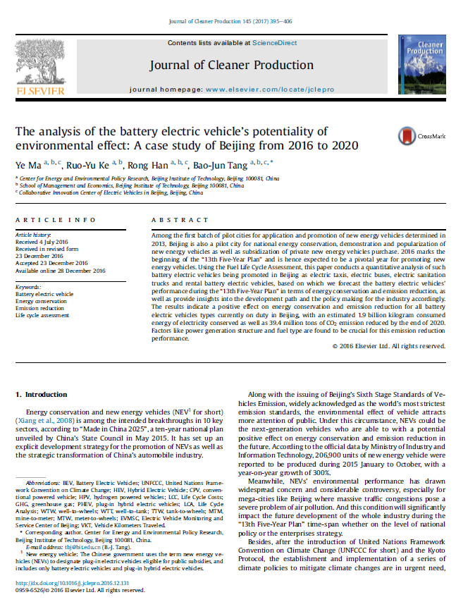 北京理工大学365bet日博备用网址唐葆君教授和博士生马也的论文The analysis of the battery electric vehicle’s potentiality of environmental effect: A case study of Beijing from 2016 to 2020发表在Journal of Cleaner Production。