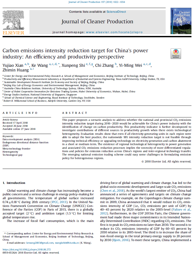 近日中心博士生鲜玉娇和导师王科、魏一鸣、黄志民等合作的研究论文Carbon emissions intensity reduction target for China’s power industry: An efficiency and productivity perspective发表在国际期刊Journal of Cleaner Production。