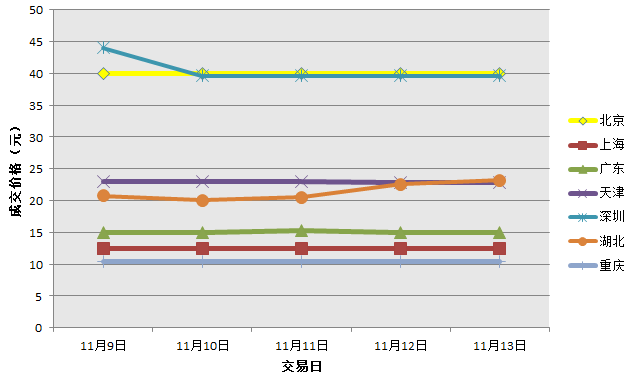 此前一周,国内碳交易试点价格在10.4-40元之间波动。其中,北京碳交易价格最高,为40元;重庆碳交易价格最低,为10.4元;湖北碳交易价格不断上涨;其他地区碳交易价格保持平稳。