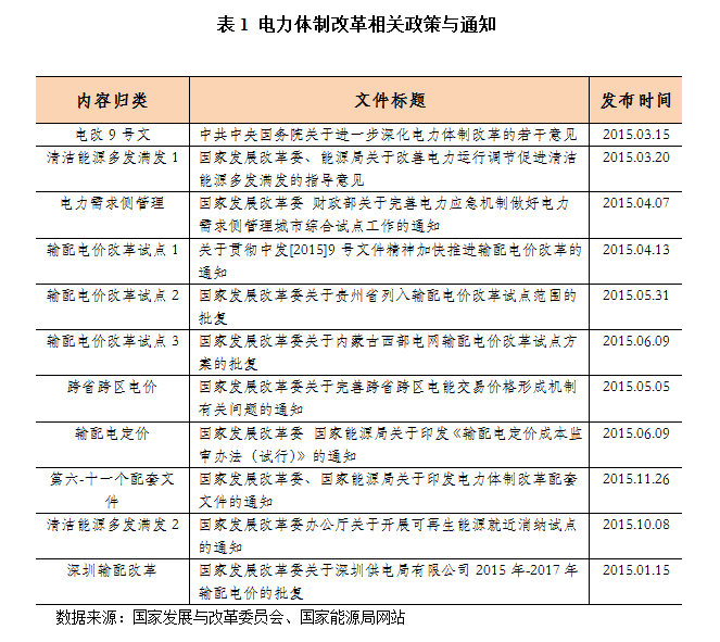 从以上信息可以看出,除了油价以外,2015年我国能源工作的重点是电力体制改革及其相关的工作(见表1)。这些电力体制改革的文件或通知具体包括11个电力体制改革配套文件(后6个配套文件统一发布)、配套辅助文件4个、可再生能源利用类相关文件5个、煤电清洁利用文件3个、电网建设文件2个、电力项目核准1个。11个电力体制改革配套文件的内容分别为清洁能源利用、电力需求侧管理、输配电价改革试点、跨省跨区送电价格形成机制、输配电定价成本监审、输配电价改革继续推进、电力市场建设、电力交易机构组建和规范运行、有序放开发用电计划、推进售电侧改革、燃煤自备电厂监督管理等11个方面。