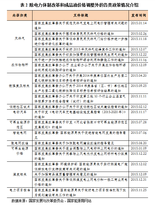 据不完全统计,2015年,国家发展与改革委员会公开发布了能源与环境相关的政策文件或通知合计50个,其中成品油价格调整的通知19个(油价降低12个,油价提高7个);天然气及相关政策5个;农作物秸秆利用2个;碳排放强度考核类通知3个;电动汽车相关类通知1个;低碳社区试点和可再生能源示范各1个;可再生能源价格2个;煤炭相关通知3个;电力项目核准1个;智能电网建设和配电网改造各1个。此外,直接涉及到电力体制改革的政策有10个。