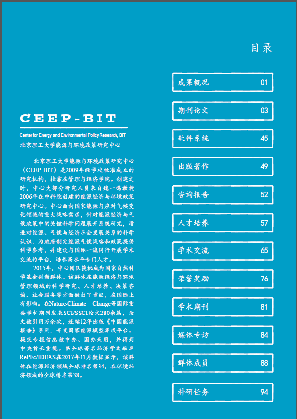 2017年度为CEEP-BIT的“能源经济与气候政策”创新研究群体获批后的第二年。创新群体在这一年中力求深化已有研究基础的同时,着眼于国内外能源经济的发展,在气候变化政策等领域开展了研究并取得了一批研究成果: