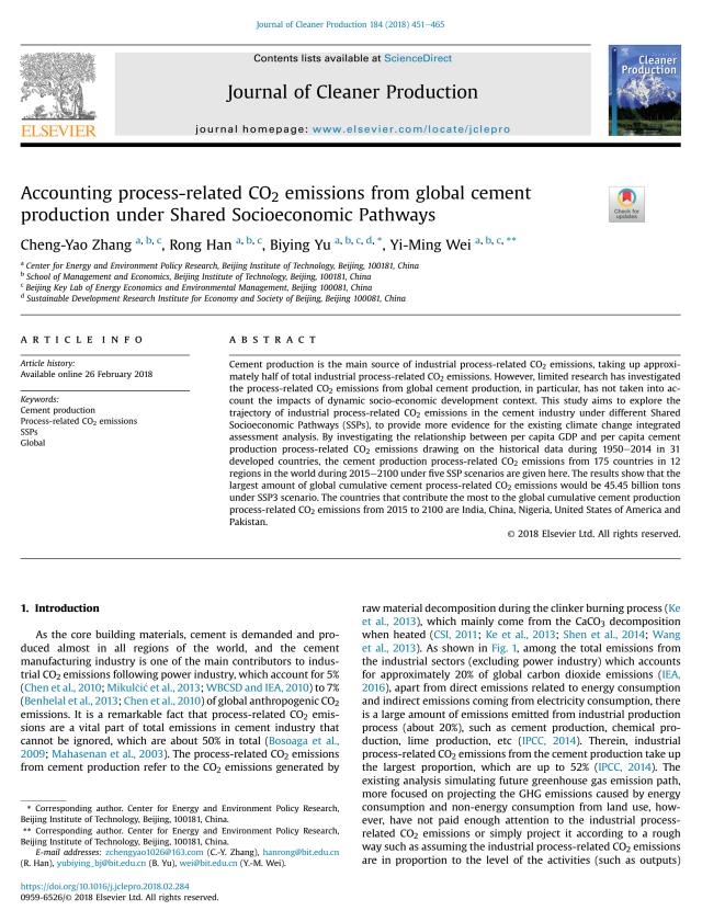 Accounting process-related CO2 emissions from global cement production under Shared Socioeconomic Pathways. Zhang C.Y., Han R., Yu B.Y., Wei Y.M., 2018